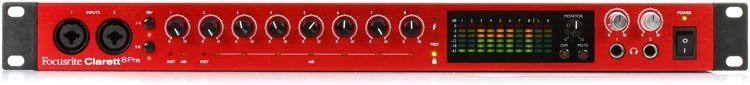 The Clarett 8Pre's eight newly designed Clarett mic preamps deliver a truly impressive dynamic range. Perfect for your studio or mobile recording rig, the Clarett 8Pre gives you a wealth of connectivity — including ADAT and MIDI I/O — all in a sleek 1U form factor. With its sonic performance, leading edge round-trip audio latency and ease of use, the Clarett 8 Pre is an excellent choice of interface.