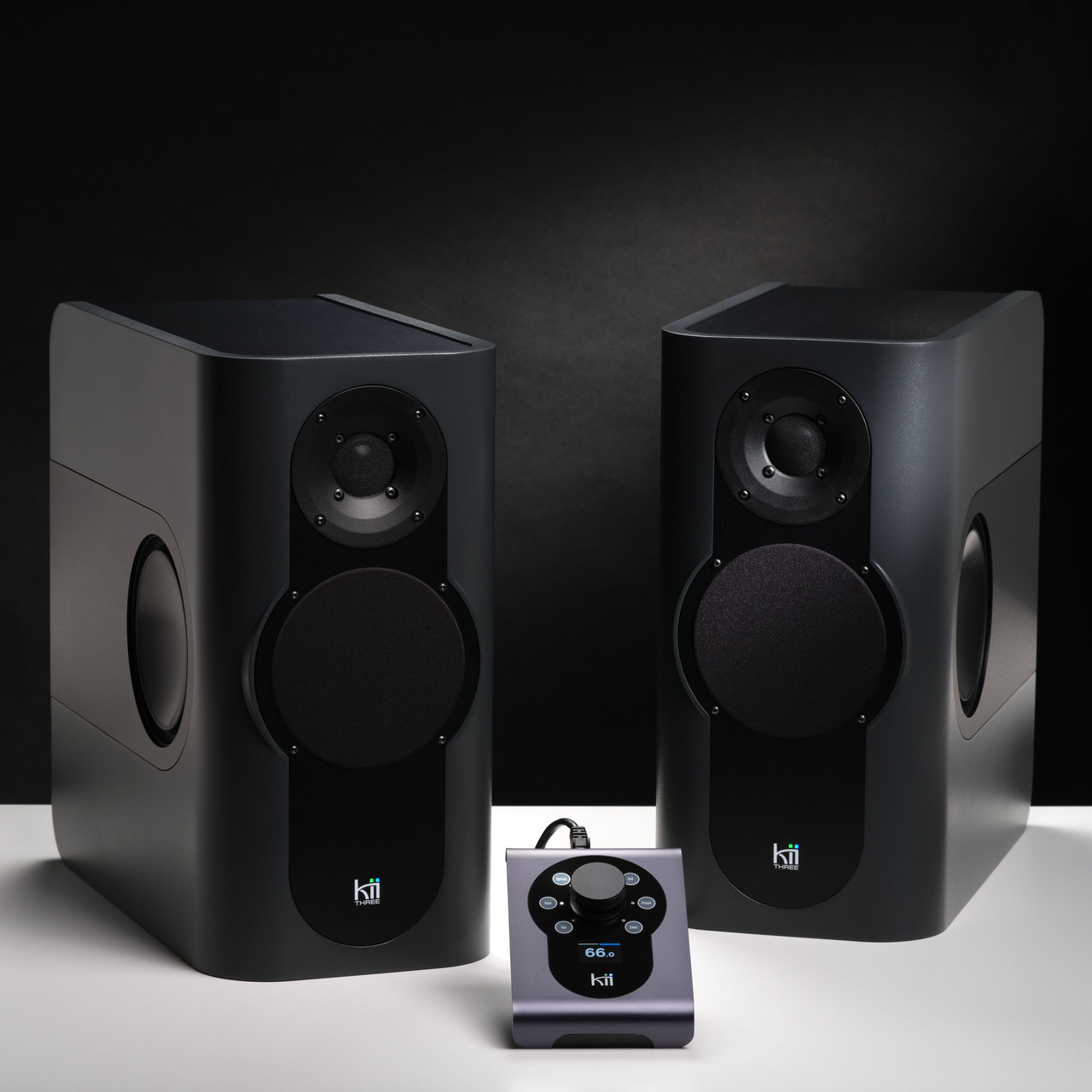 2 x Kii THREE speakers in Fine Touch Dark Gray finish