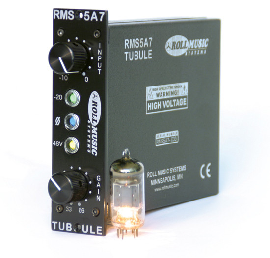 The RMS5A7 Tubule from Roll Music Systems combines the full-featured convenience of a modern mike preamp module with the rich, satisfying sound of a transformer-coupled, all-tube preamp evocative of the elusive bygone classics. This is not a wimpy starved-plate design, nor is it an op-amp based preamp with a tube stuck on top for marketing appeal. It's all tubes and iron, with sophisticated modern power management circuitry to generate the high-voltage plate supply and high-current heater supply to power the tube. Careful design of this high-efficiency power circuit allows the Tubule to work within the space and power consumption limitations of a single module.